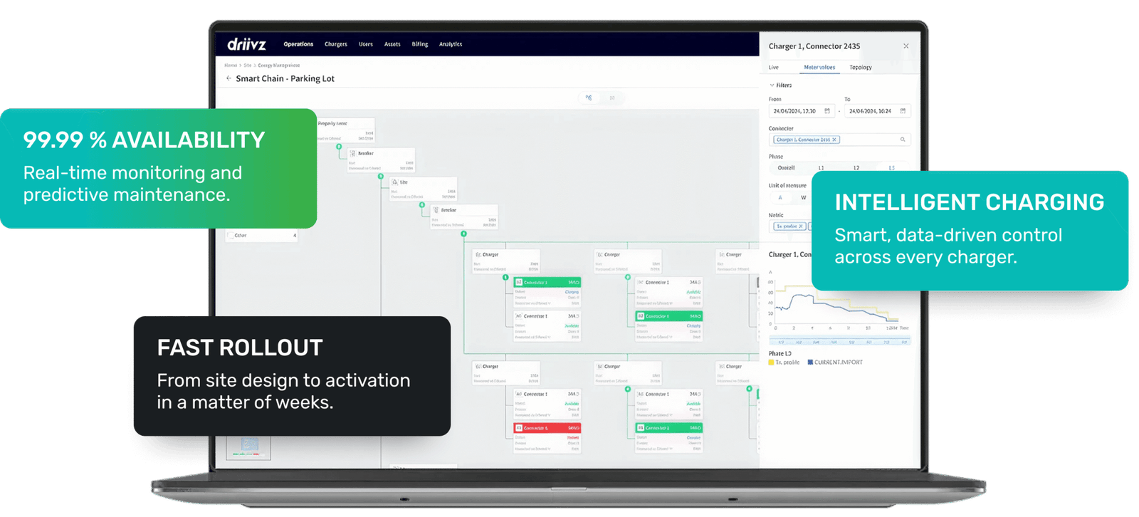 Intelligent EV charging networks that help communities move faster toward cleaner transport — with 99.99 % uptime and the fastest rollout in the UK.